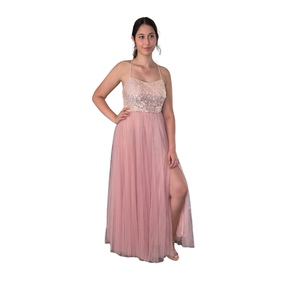Sahara is wearing our Lindy Dress in a Blush pink, size 14. Zip up back with crossed back, sequin top with a soft tulle skirt with spilt.