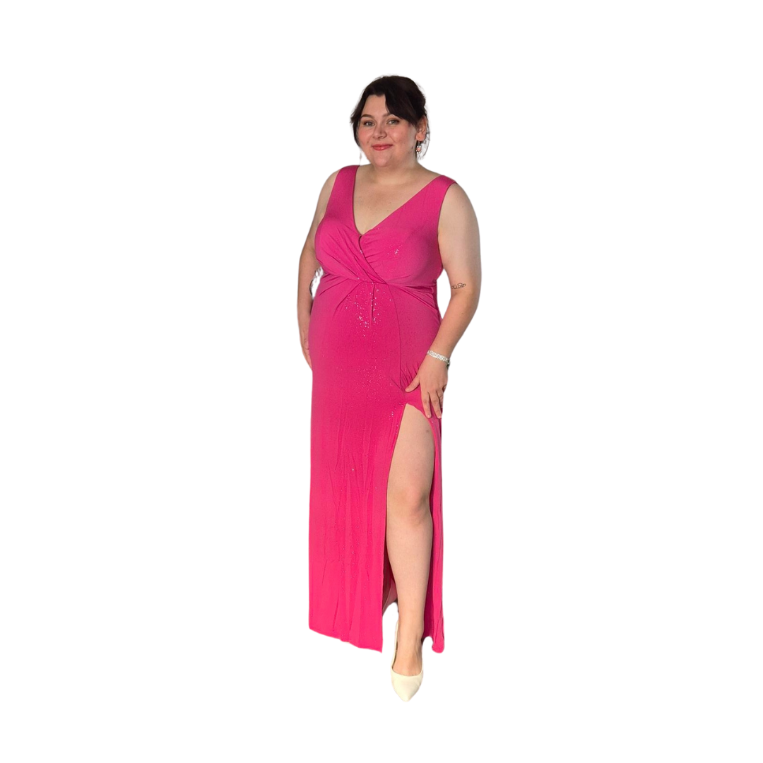 Sahara is wearing the Blair Dress. Size 14. Beautiful Hot Pink with Slight sparkle throughout. V-crossover neckline, thigh high split. Zip up back. Available in sizes 14 & 16.