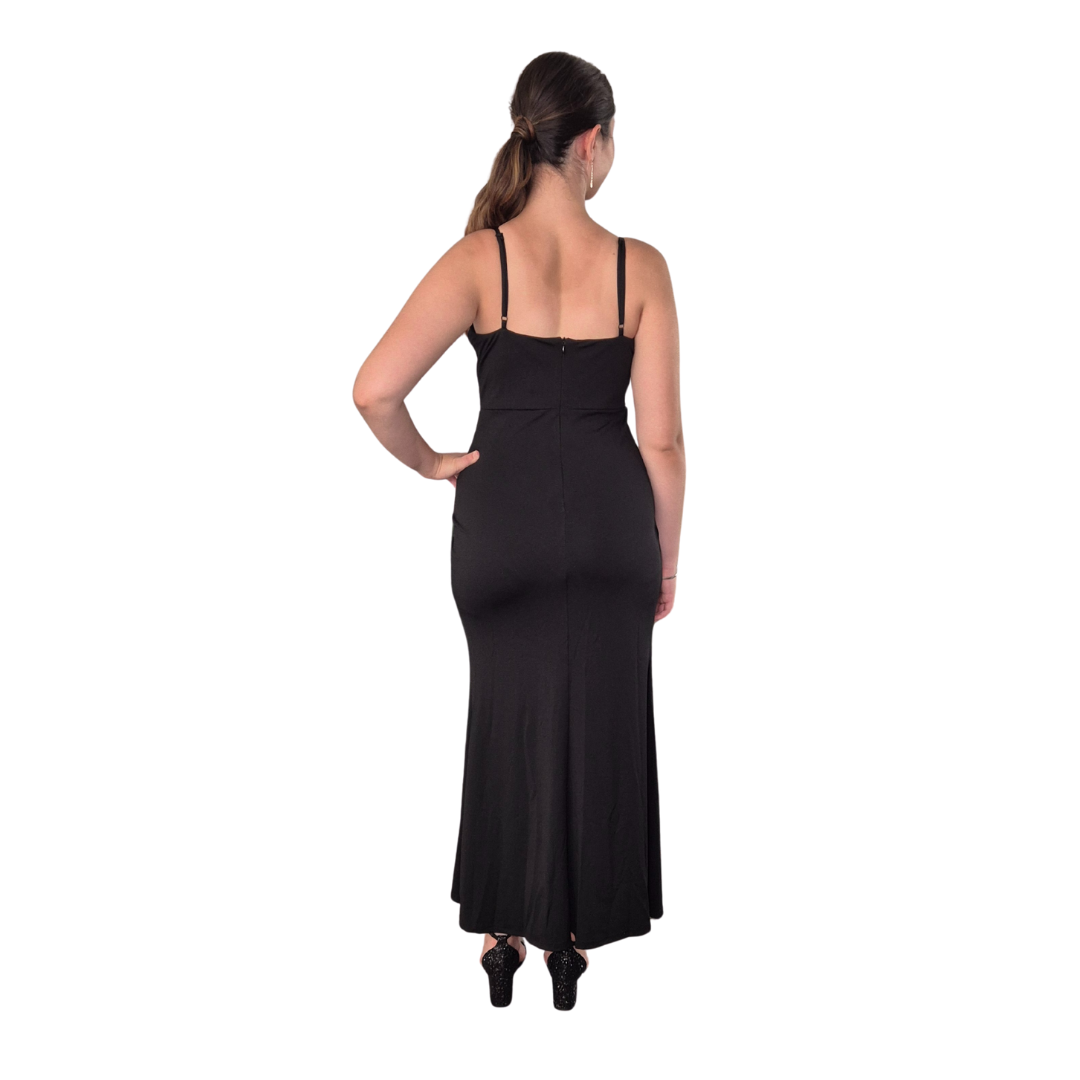 Sahara wearing the simple yet stunning black Steph dress in a size 14. Adjustable straps, with stone feature along the breast line.