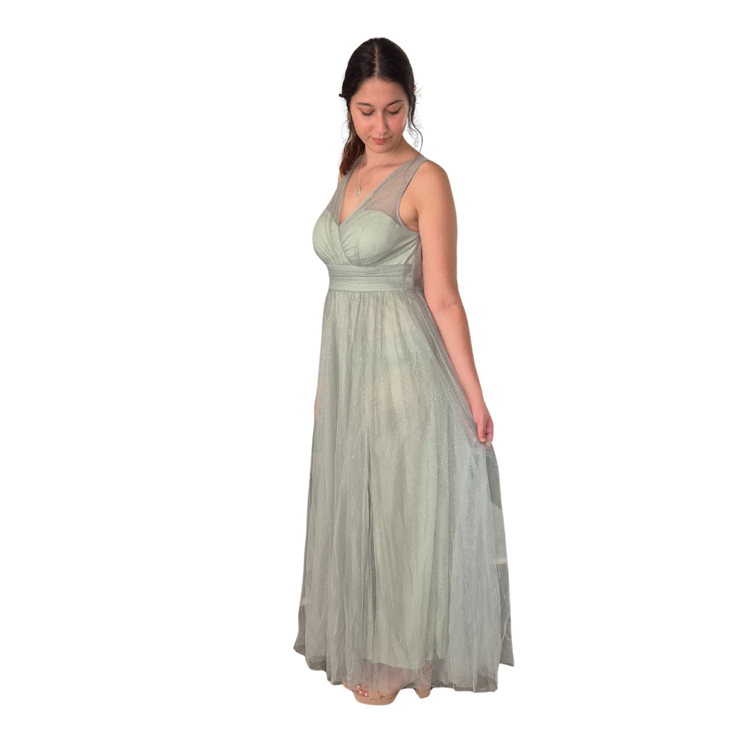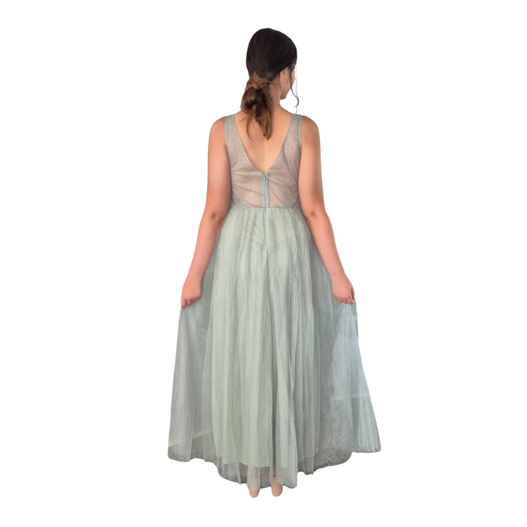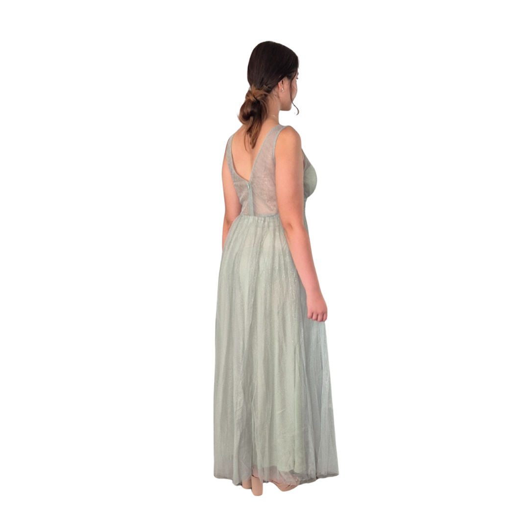 Sahara is wearing the Tink Dress in a pale Sage Green in a size 14. Beautiful sheer outer layer with a gold speck throughout. Sheer back. A dreamy look.