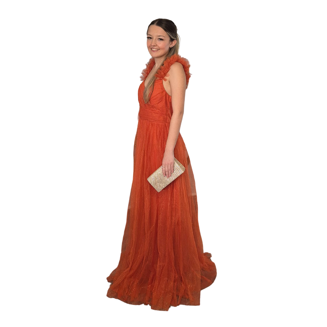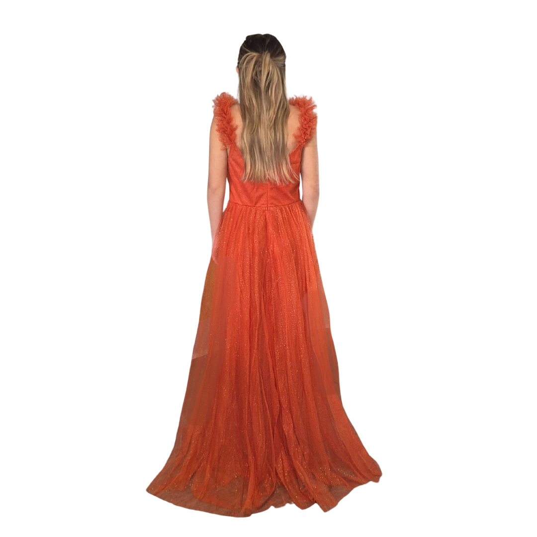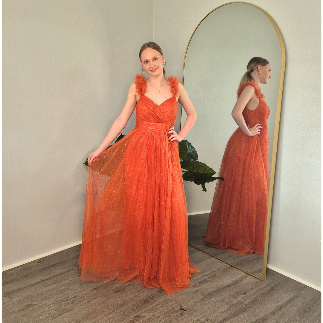 Bridie wearing this goregous piece in a size 8. Tulle all over. Featured straps for that stand out look.